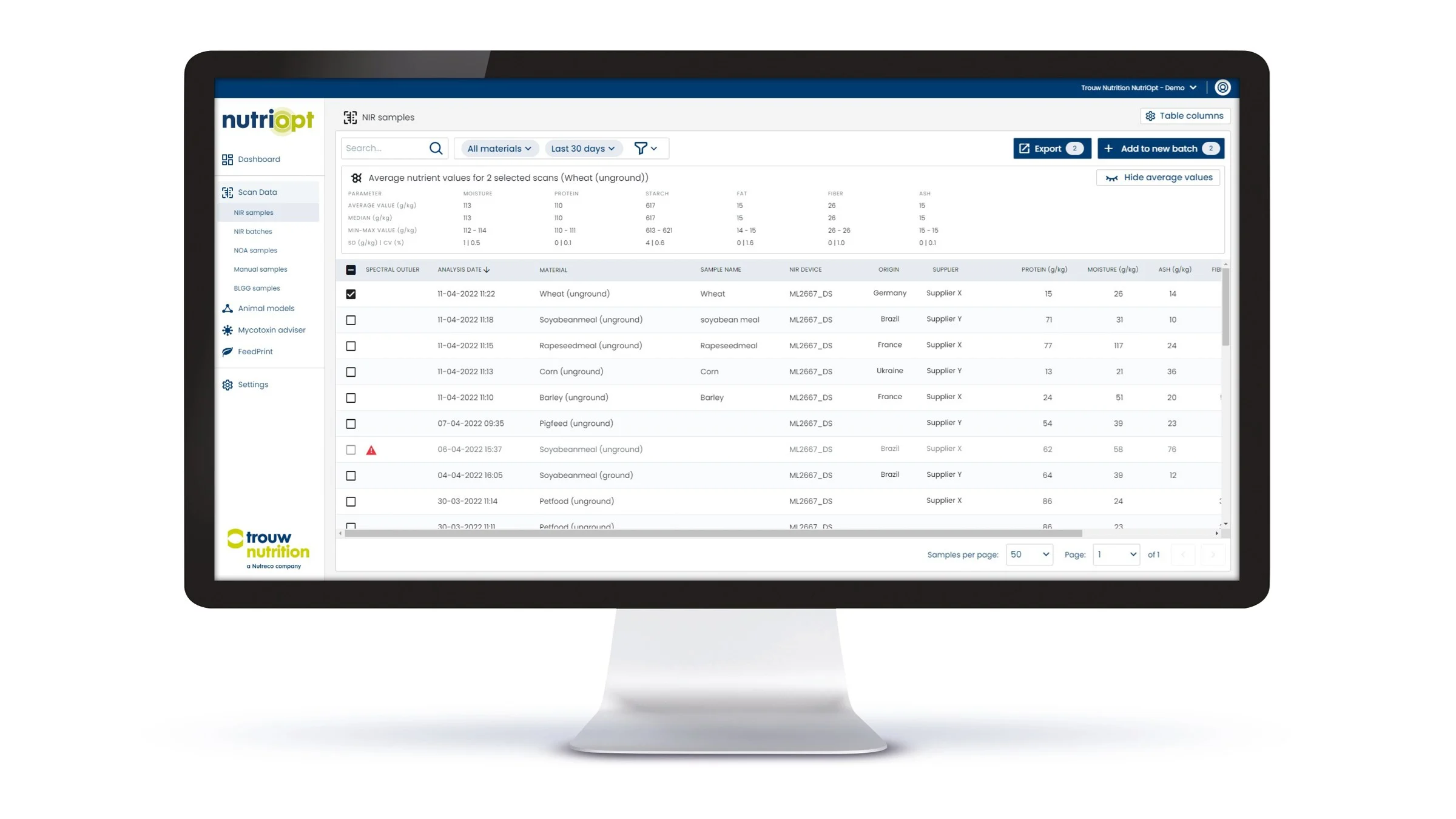 每日完成数以千计的饲料及原料成分分析。使用FOSS近红外设备的用户,可连接至依托泰高营养ISO认证营养数据库构建的MyNutriOpt平台。该平台将分析结果以直观清晰的图表形式呈现。
